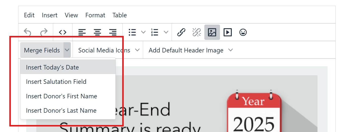 Merge fields are things like the date, your donor's first name and last name, and salutation. Use the Merge Fields to personalize your letter, i.e., Dear Caroline, Dear Mr. Rutherford, Greetings Mr. and Mrs. Larry Upton.
