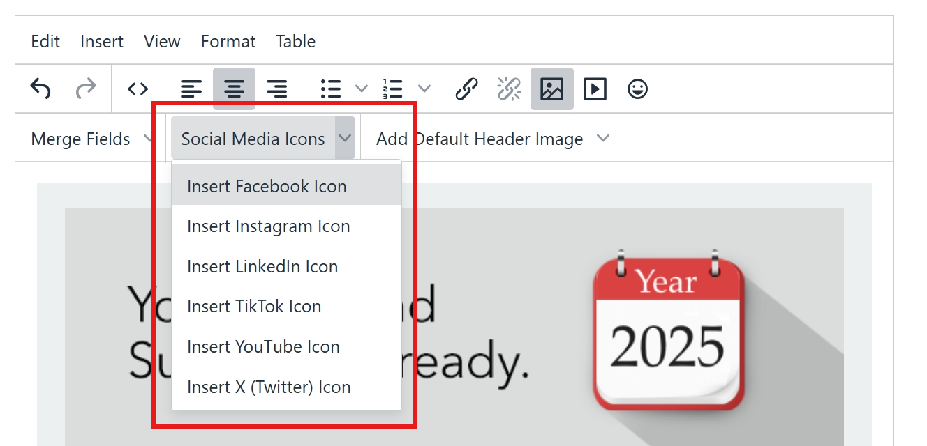 To add a social media icon, place your cursor where you want the icon to appear. Then select the icon from the social media dropdown list.