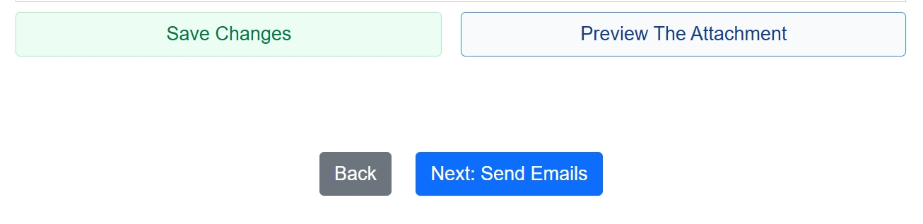 When you are done and have saved your changes, you can preview the attachment, go back to the email letter, or go to step 3 by clicking the "Next: Send Emails" button.