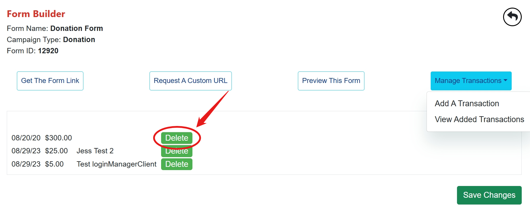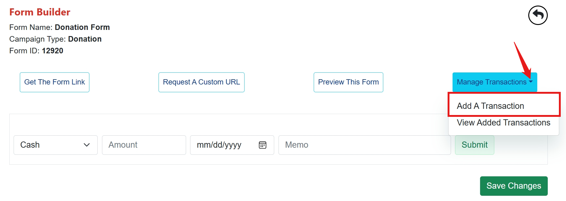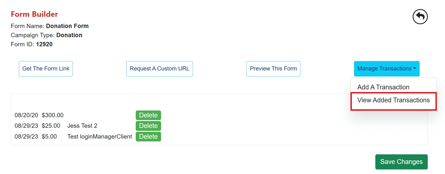 You can see the amounts you've added by clicking on the "View Added Transactions." You can also see the added transactions in your Transaction Reports. The donor's name will not appear in the transaction report. Instead, it will be displayed as "Other Campaign Transaction", so keep the donor's information recorded elsewhere.